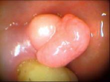 Fibrom (Bindegewebstumor). Fibrome sind sehr langsam wachsende Geschwülste des Bindegewebes. Sie treten einzeln oder vermehrt auf sind aber gutartig. Im Bild eine Fibrom an der Lippe. |